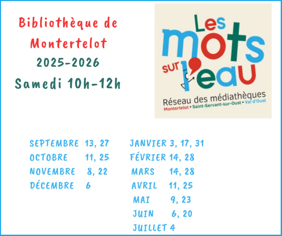 La bibliothèque de Montertelot est ouverte le samedi matin de 10h à 12h suivant un planning annuel. Les dates d’ouvertures pour 2025-26 :